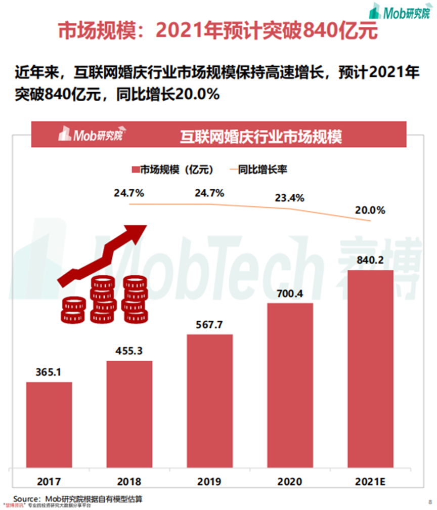 據(jù)艾媒咨詢報(bào)告分析,目前中國(guó)20-40歲的適婚人口總量約為4.47億人,大量的適婚人口,為中國(guó)婚慶市場(chǎng)增加了潛在客戶。而隨著居民收入的增加和生活品質(zhì)的提高,婚慶質(zhì)量要求逐年上升,形式趨于多樣化,形成了巨大的增量市場(chǎng)。