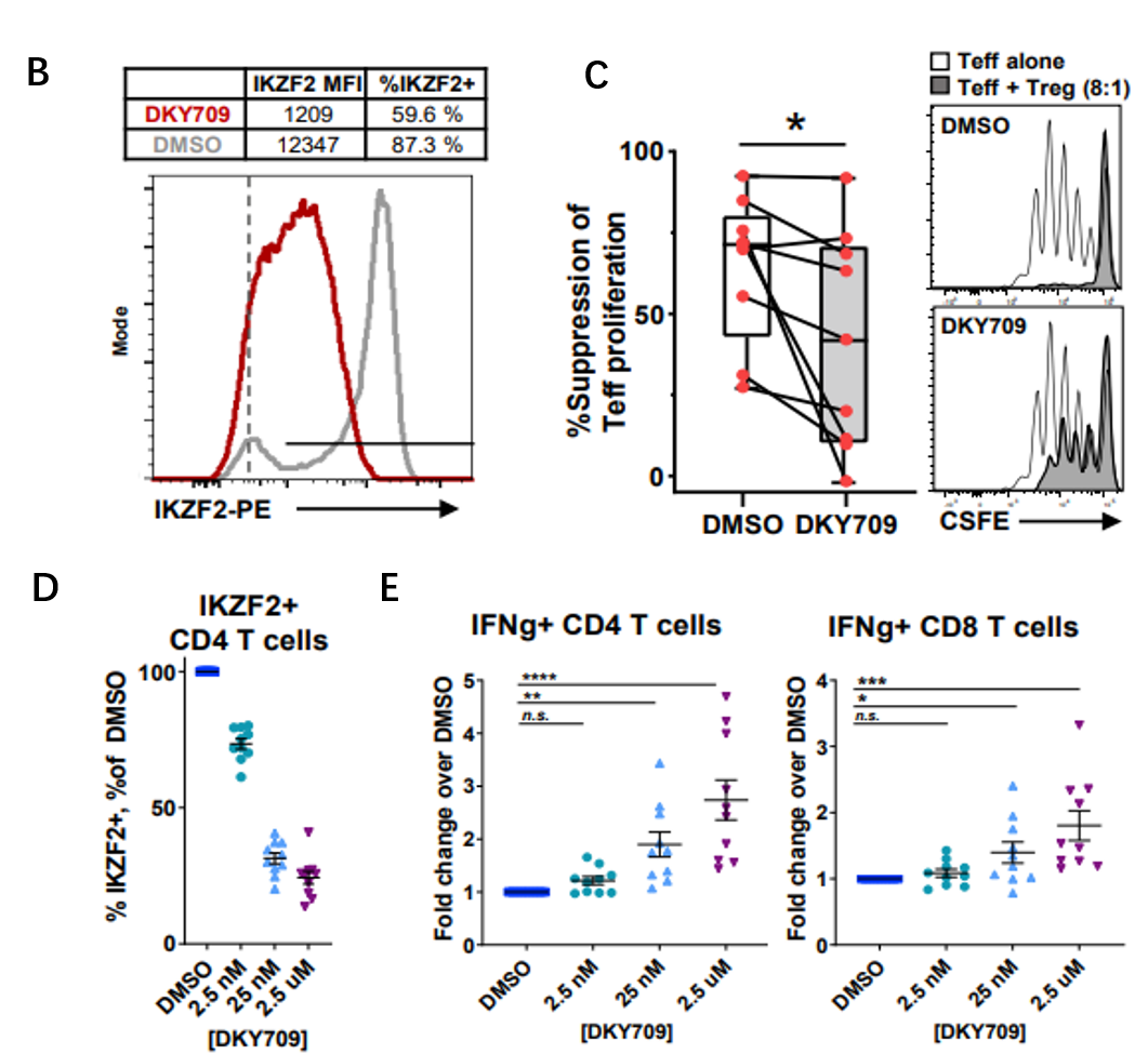 圖5 A.D&E的圈門策略; B.人原代Treg細胞體外孵育10μM DKY709或DMSO的數(shù)據(jù),包括%IKZF2+和IKZF2 MFI;C.人原代Treg細胞在DKY709作用下會擴增,并抑制Teff細胞增殖;D&E不同濃度DKY709作用于重復TCR刺激誘導的功能失調(diào)的Teff細胞,IKZF2+以及IL-2和IFN-γ水平的變化