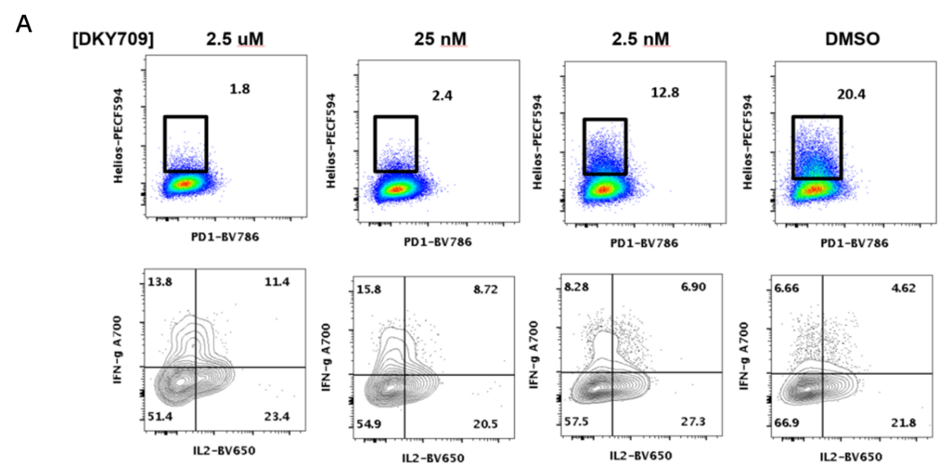 NVP-DKY709,一種IKZF2(Helios)轉(zhuǎn)錄因子的選擇性降解物,不降解IKZF1/3。研究表明,NVP-DKY709在體外可降低人調(diào)節(jié)性T細胞的抑制作用,并使耗竭Teff分泌細胞因子,降低小鼠的腫瘤生長,并降解猴子和人體內(nèi)的IKZF2。