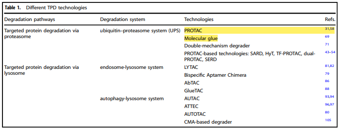 靶向蛋白質(zhì)降解(TPD)目前主要通過泛素蛋白酶體和溶酶體降解目標蛋白,根據(jù)具體作用原理又可細分為近10個不同技術(shù)路線,其中發(fā)展最快的是分子膠和PROTAC技術(shù)。