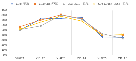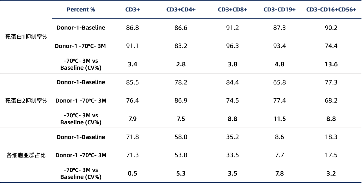 -70℃凍存3個月,與基線相比,各亞群的占比%CV范圍為:0.5%-7.8%。