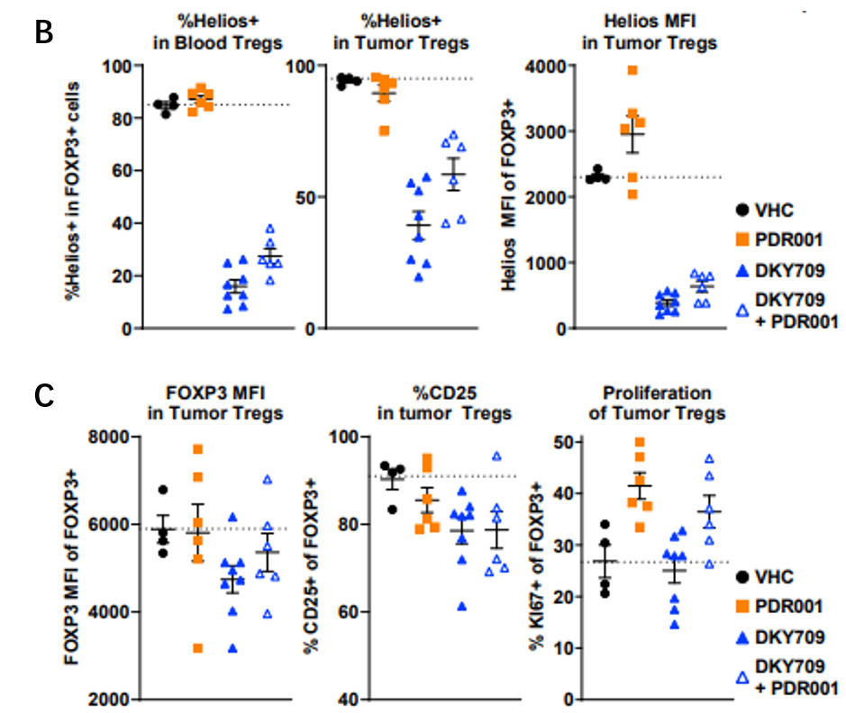 圖7 A. B&C的圈門策略;B. 人源化小鼠MDA-MB-231腫瘤移植模型中IKZF2在原代Foxp3+ Treg細胞中的體內(nèi)降解,血液(左)和腫瘤浸潤(右);C. 通過流式細胞術(shù)評估DKY709和PD1阻斷治療對腫瘤浸潤性Treg細胞Foxp3 MFI和CD25表達和增殖的影響