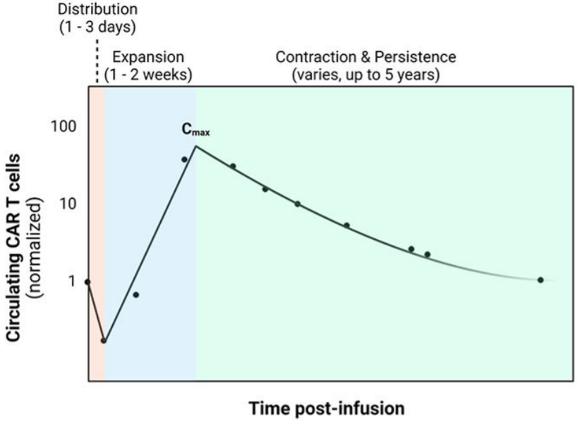 與常規(guī)抗腫瘤藥物不同,CAR-T細(xì)胞是活體藥物,具有增殖能力和獨(dú)特的細(xì)胞動(dòng)力學(xué)特征。CAR-T細(xì)胞輸注體內(nèi)后,在體內(nèi)主要經(jīng)歷四個(gè)階段:分布(Distribution)、擴(kuò)張(Expansion)、收縮(Contraction)和持續(xù)階段(Persistence)。