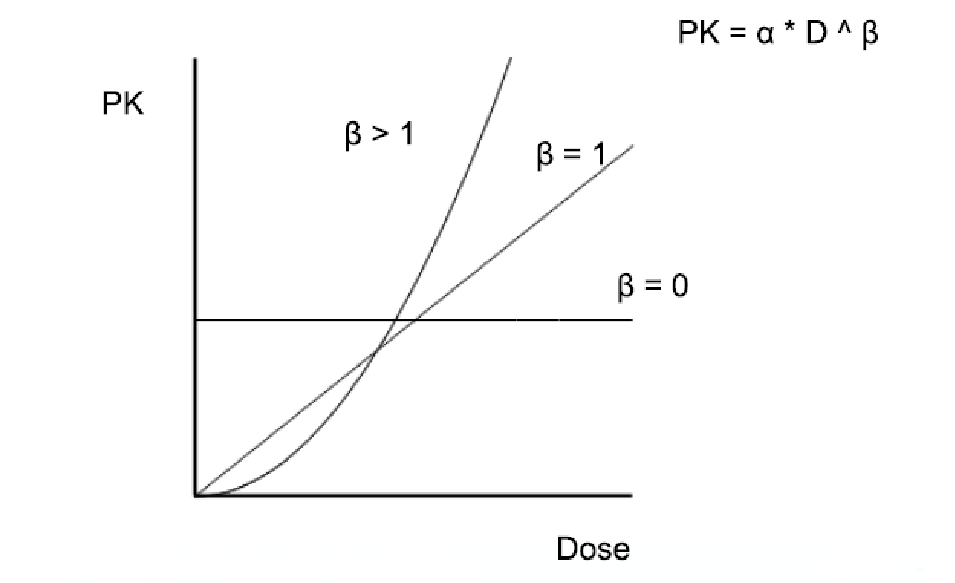 劑量線性評估是為了充分了解劑量與PK暴露水平之間的關系,考慮到主要的PK暴露參數(shù)呈現(xiàn)對數(shù)正態(tài)分布,常用冪指數(shù)模型(Power Model)方法進行分析。圖1形象解釋了Power Model模型: