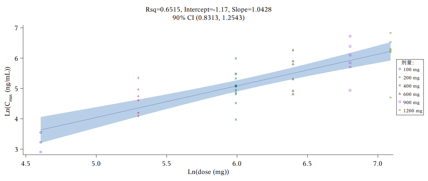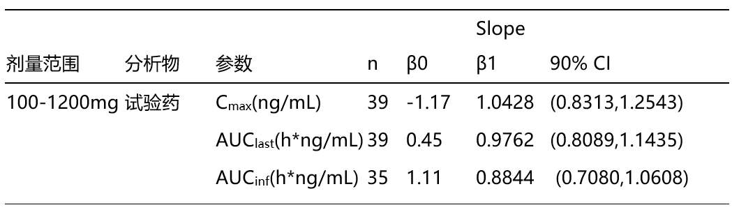 右上角所示公式是Power Model的原公式,顯示數(shù)學上的冪指數(shù)關系,其中PK代表PK參數(shù)(AUC0-t、AUC0-inf、Cmax)。由于這些PK參數(shù)呈現(xiàn)對數(shù)正態(tài)分布,我們將其取對數(shù)可以得到:log(PK)=β0+β1×log?(Dose) ,其中β0代表截距項,β1為斜率,表征比例化劑量反應關系的程度。期望的比例化劑量反應關系要求斜率β1接近于1。