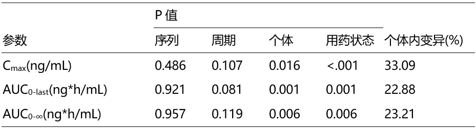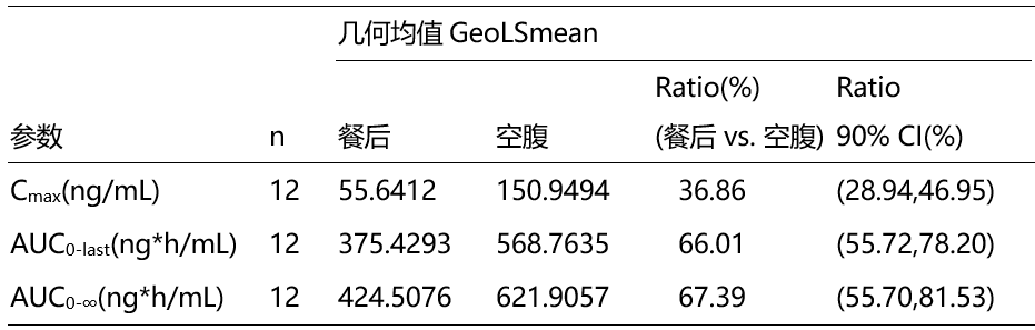 創(chuàng)新藥生物等效性(以PK為終點),是指在相似的試驗條件下單次或多次給予相同劑量的試驗藥物后,變更后制劑中藥物的吸收速度和吸收程度與變更前制劑的差異在可接受范圍內。它常用的試驗設計同食物影響,因而統(tǒng)計分析策略也相同:即需要計算PK參數(shù)(Cmax、AUC0-last和AUC0-∞)幾何均值比值(受試/參比試劑)及其90%可信區(qū)間的估計,當PK參數(shù)(Cmax、AUC0-last和AUC0-∞)的幾何均值的比值的90%置信區(qū)間完全落在0.80~1.25范圍內,則可以認為生物等效。