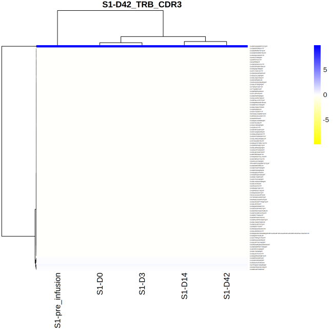 上圖為不同樣本的克隆頻率聚類熱圖,其中,每一列為一個樣本,每一行為一種克隆。按克隆類型進行聚類,反應(yīng)樣本間的克隆分布的相似性。藍色表示該克隆在對應(yīng)樣本中克隆頻率較高,黃色表示該克隆在對應(yīng)樣本中克隆頻率較低。
