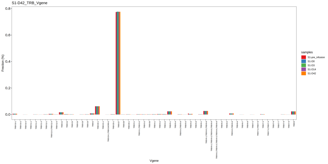 上圖為不同樣本的 V 基因頻率分布柱狀圖,其中,X軸表示不同的 V 基因,Y軸表示克隆頻率,不同的樣本由不同顏色表示。