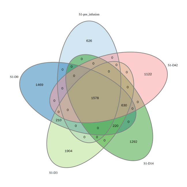 上圖為多個樣本中克隆類型一致性分布的韋恩圖。該圖支持2~5個樣本的可視化,圖中的數(shù)字表示重疊樣本的共有克隆的數(shù)目。
