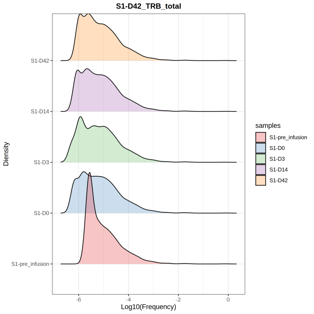 上圖為多個樣本的克隆豐度的密度分布圖。其中 X 軸 Log10(克隆頻率), Y 軸表示處于該區(qū)間的克隆頻率的百分比。反應(yīng)不同樣本的克隆豐度組成變化情況。