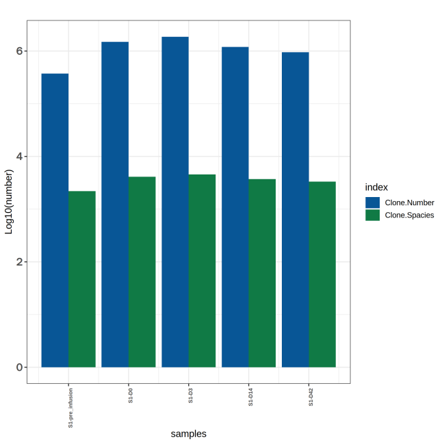 上圖為不同時間節(jié)點樣本的 TCR 克隆數(shù)統(tǒng)計圖。X軸為不同時間節(jié)點的樣本,柱形圖展示了不同樣本的 TRB 的克隆類型與克隆總數(shù),Y軸為Log10(克隆數(shù))。