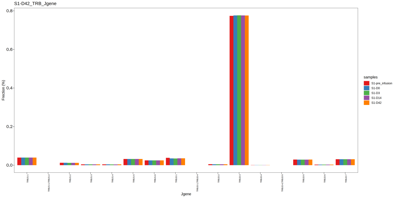 上圖為不同樣本的 J 基因頻率分布柱狀圖,其中,X軸表示不同的 J 基因,Y軸表示克隆頻率,不同的樣本由不同顏色表示。