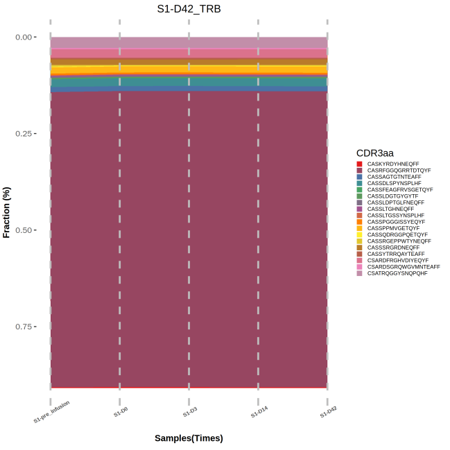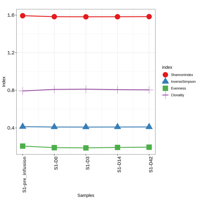 上圖為不同時間節(jié)點樣本的 TCR 多樣性指數(shù)統(tǒng)計圖。X軸為不同時間節(jié)點的樣本,折線圖展示了不同樣本的 TRB 的克隆克隆多樣性指數(shù)。
