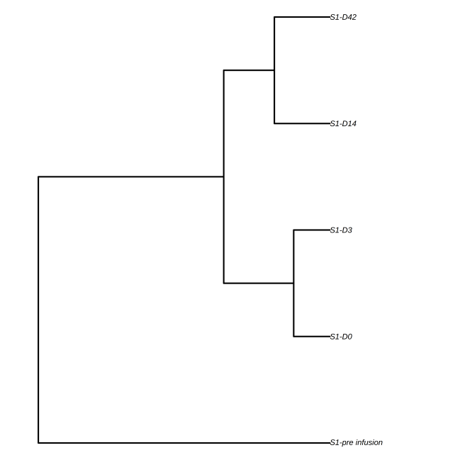 上圖展示了多個樣本的樹狀結(jié)構(gòu),分支長度顯示了樣本克隆序列之間的距離。