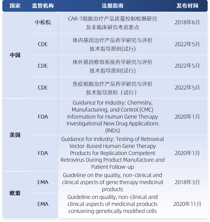 針對(duì)RCV的風(fēng)險(xiǎn),中國(guó)、美國(guó)及歐洲的藥品監(jiān)管機(jī)構(gòu)均發(fā)布了明確的指導(dǎo)原則,要求在病毒載體的設(shè)計(jì)上應(yīng)盡可能降低與野生型病毒相關(guān)的任何致病性,并盡可能將病毒重組和回復(fù)突變的風(fēng)險(xiǎn)降到最低。同時(shí),在產(chǎn)品的生產(chǎn)和應(yīng)用的不同階段進(jìn)行RCL的控制,以保障患者的用藥安全。相關(guān)法規(guī)指南如下: