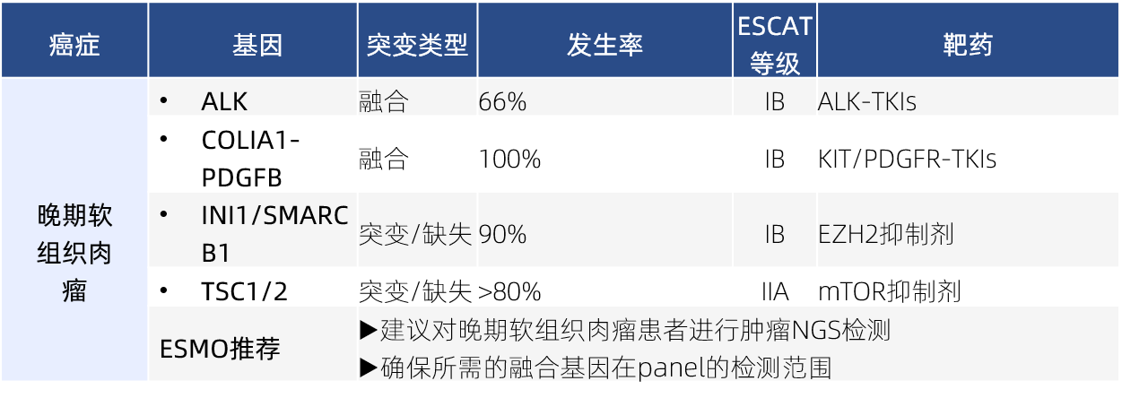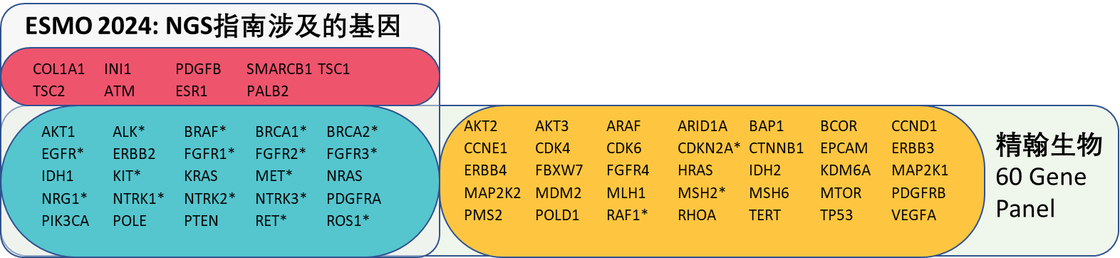 ESMO 2024 NGS指南共提及34個(gè)ESCAT I/II 類核心基因,還將MSI,HRD,TMB和dMMR等泛瘤種生物標(biāo)志物作為某些癌種的靶向標(biāo)志物。在一些癌種的NGS檢測(cè)中,指南強(qiáng)調(diào)需關(guān)注融合基因的檢測(cè)。此外,與2020年的推薦一樣,ESMO建議臨床研究中心為轉(zhuǎn)移性癌癥患者進(jìn)行多基因測(cè)序,以加速臨床研究。
