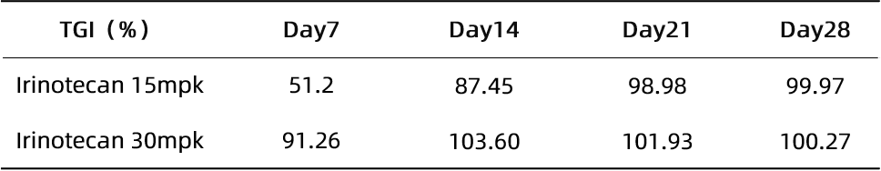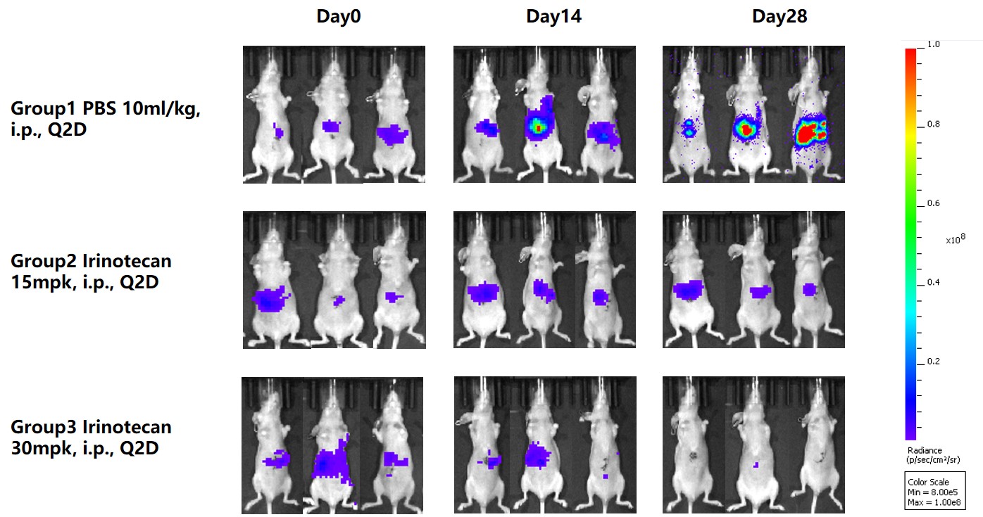 通過圖1, 2 和3可以看到,腫瘤彌散的程度逐漸擴(kuò)大,腫瘤細(xì)胞熒光信號的強(qiáng)度逐漸增強(qiáng)。而伊立替康給藥組的熒光信號則逐漸減弱,這表明伊立替康可以顯著地抑制HT-29-luc肝轉(zhuǎn)移腫瘤生長,并且存在梯度效應(yīng)。