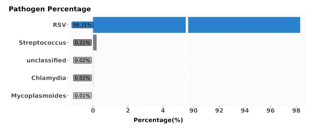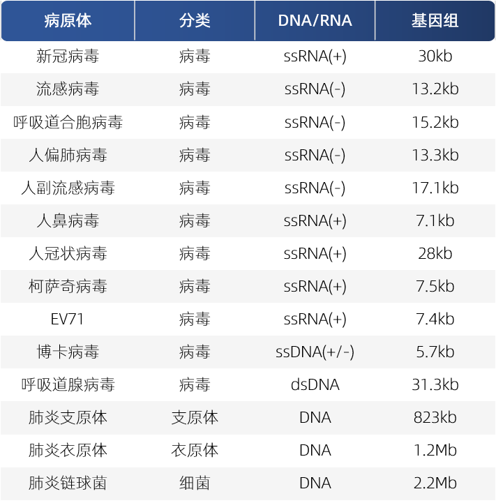 本檢測對包括呼吸道合胞病毒在內(nèi)的14種呼吸道病原體(呼吸道合胞病毒、新型冠狀病毒、流感病毒、普通冠狀病毒、副流感病毒、腺病毒、鼻病毒、偏肺病毒、博卡病毒、柯薩奇病毒、腸道病毒、肺炎支原體、肺炎衣原體、肺炎鏈球菌)基因組全長進行測序。
