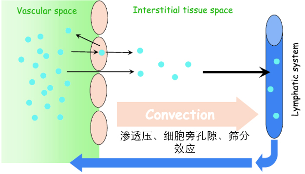 BsAb從體循環(huán)到組織間隙的轉(zhuǎn)運與其他蛋白類藥物類似,主要通過對流轉(zhuǎn)運而非擴散,從而遵循從血管間隙到組織間隙的單向轉(zhuǎn)運,隨后從組織間隙轉(zhuǎn)運回血管內(nèi)的過程由淋巴系統(tǒng)介導。