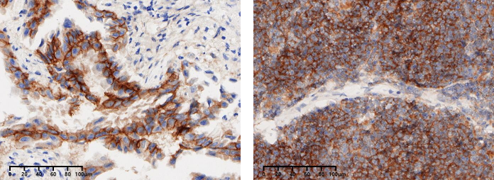 ROR1的免疫組化(IHC)染色在臨床診斷和研究中具有重要意義,其染色特點主要表現(xiàn)為細胞膜和/或細胞質(zhì)的特異性著色。ROR1的陽性表達通常呈現(xiàn)為清晰的膜染色,有時伴有細胞質(zhì)染色,但單純的細胞質(zhì)染色需謹慎判讀,以避免假陽性結(jié)果。在判讀過程中,正常組織(如脂肪組織或胰腺)可作為內(nèi)對照,確保染色質(zhì)量。不同抗體的染色結(jié)果可能存在差異,建議使用經(jīng)過嚴格驗證的商業(yè)化抗體。熙寧生物已經(jīng)利用相關(guān)抗體建立起ROR1的免疫組化檢測方法,歡迎廣大客戶垂詢。