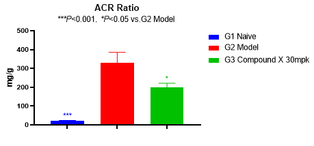 蛋白尿水平常作為臨床研究的替代終點(diǎn)。2021年12月,F(xiàn)DA首次基于蛋白尿下降這一替代臨床終點(diǎn)批準(zhǔn)了IgA腎病新藥TARPEYO(布地奈德)。如圖3所示,模型組大鼠的尿ALB水平和UACR顯著升高。待測(cè)化合物給藥6周后,尿ALB水平和UACR顯著性下降。