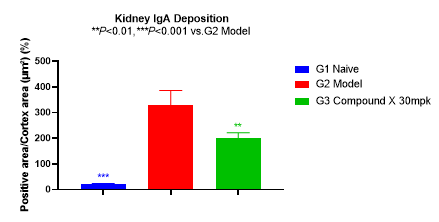 本實(shí)驗(yàn)通過(guò)單側(cè)腎切除術(shù)聯(lián)合BSA/LPS/CCL4誘導(dǎo),成功建立了大鼠IgA腎病動(dòng)物模型。大鼠尿ALB水平和UACR值顯著升高,腎小球IgA和C3沉積水平顯著增加,部分模擬了臨床患者的癥狀,符合患者的臨床表現(xiàn),與文獻(xiàn)報(bào)道基本一致。藥物處理6周后,尿ALB水平和UACR有明顯的下降,腎小球 IgA和C3的沉積水平顯著下降,表明該模型可用于評(píng)估藥物對(duì)于IgA腎病的治療效果。