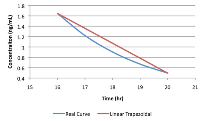 下圖說明了線性梯形法和對數(shù)梯形法的區(qū)別。藍(lán)線表示藥物濃度的真實單指數(shù)下降,紅線表示使用線性梯形法估計的AUC。由于線性梯形法假設(shè)采樣點之間呈直線下降(在16和20 h),因此它高估了藥物暴露。