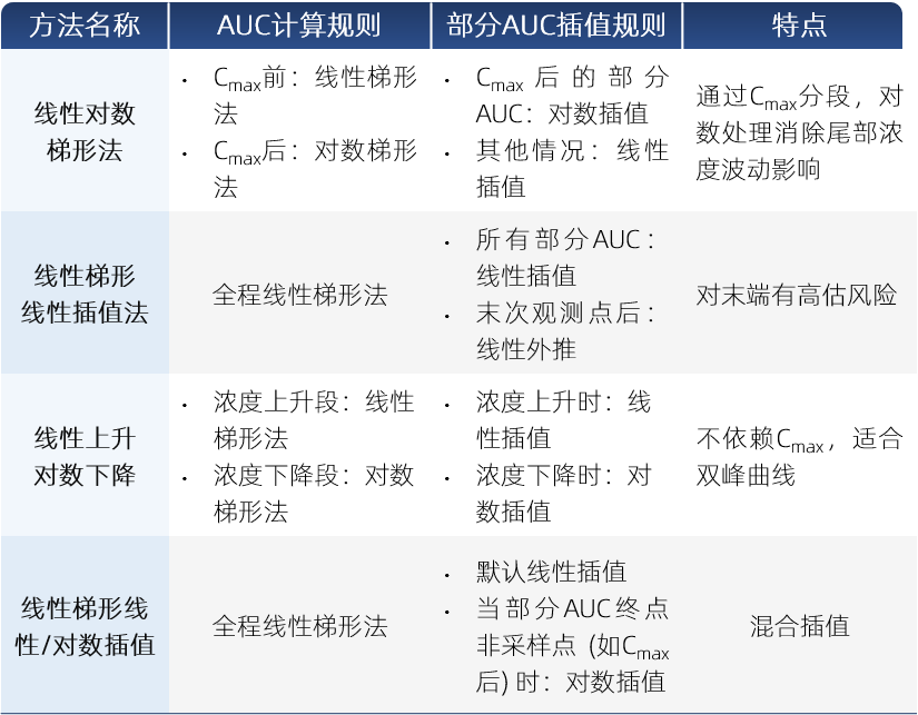 最優(yōu)方法:Linear-Up/Log-Down法(吸收階段用線性法,消除階段用對數(shù)法)通常最準(zhǔn)確,因其更貼合藥物動力學(xué)特征。