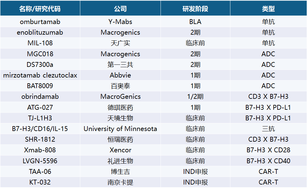 目前以CD276為靶點的在研藥物已超40個,涉及單抗、雙抗、ADC、CAR-T等各個領域(如下圖所示)。