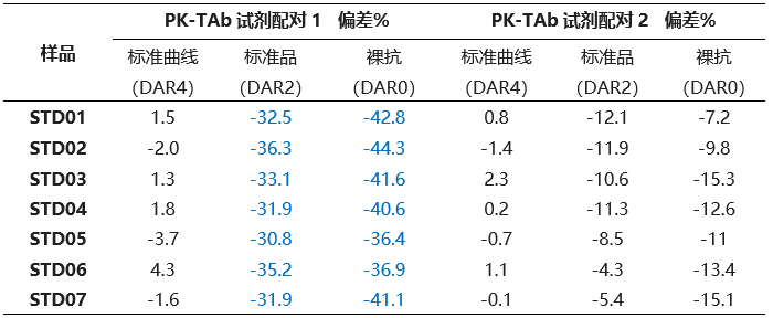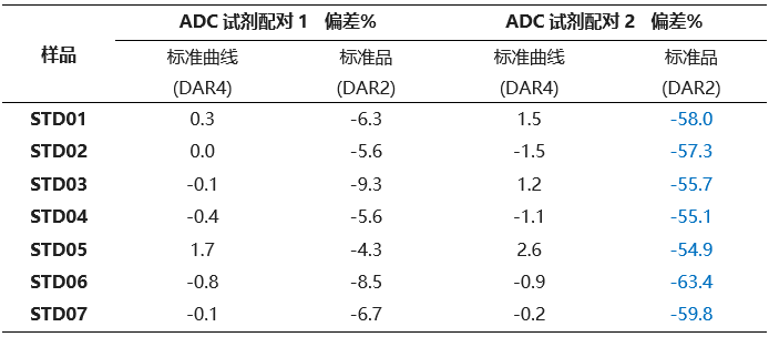 例如上表中的例子,在該例子中,ADC的平均DAR值是4,從不同配對試劑的結(jié)果來看,對于總抗體的測試數(shù)據(jù),其試劑配對1在低DAR值標(biāo)準(zhǔn)品及裸抗檢測時,測定結(jié)果明顯偏低,試劑配對2受DAR值影響較??;對于ADC的方法而言,其試劑配對1受DAR值影響較小,但試劑配對2在檢測低DAR值標(biāo)準(zhǔn)品時明顯結(jié)果偏低。在這個例子中,如果我們在總抗體和ADC的檢測上,都選擇其相應(yīng)的試劑配對1,在實際的樣品檢測中,很可能會出現(xiàn)ADC濃度大于總抗體的情況,因為總抗體檢測結(jié)果在DAR值變低后是偏低的。另外,如果我們在總抗體和ADC的檢測上,都選擇其相應(yīng)的試劑配對2,結(jié)果很可能會出現(xiàn)ADC濃度明顯低于總抗體的情況,看上去像是ADC分子的毒素有很多全部脫落了,但其實和方法學(xué)也有不小的關(guān)系。