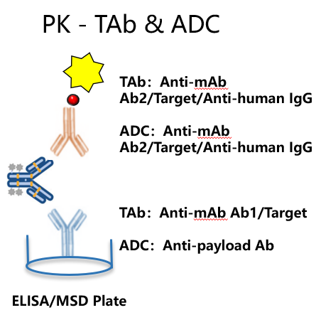 對于反映ADC藥物PK特征的總抗體和ADC的檢測,目前LBA是最常用的檢測方式,從方法設(shè)計上來說,對于總抗體,可以使用一對試劑對來分別作為捕獲和檢測試劑,這里的試劑可以考慮使用特異性的抗ADC抗體端的抗體、靶點蛋白、通用型的抗IgG抗體。對于ADC的檢測,通常使用抗小分子藥物的抗體作為捕獲試劑,再使用抗ADC抗體端的抗體、靶點蛋白或者通用型的抗IgG抗體作為檢測試劑進行試劑配對組合。