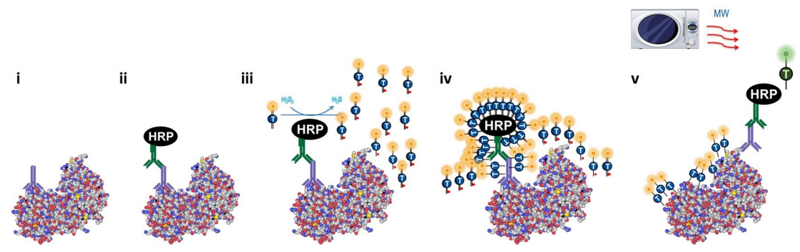多色免疫熒光有多種技術(shù)路線,目前最為成熟的方法是基于酪胺信號放大技術(shù)(tyramide signal amplificatio, TSA)。該技術(shù)利用二抗上標記的辣根過氧化物酶(HRP)催化底物過氧化氫,使加入反應體系的帶有熒光標記的酪胺被氧化為活化狀態(tài),并能與組織樣本中富含的酪氨酸殘基共價結(jié)合,從而在特定的抗原位置形成熒光信號。該信號不受微波影響,因此可通過微波加熱去除抗體再進行下一輪的一抗、二抗孵育(圖1, 2)[1]。