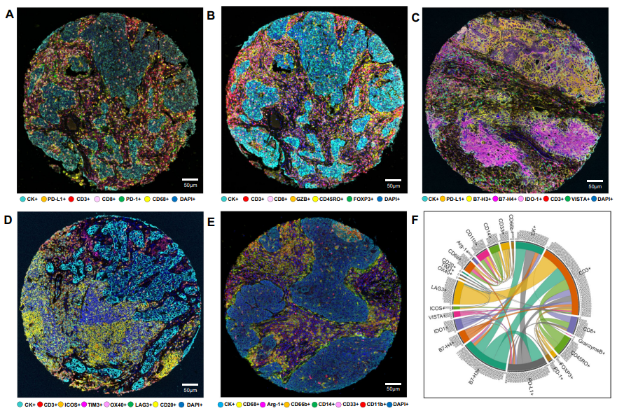 基于TSA技術(shù)可在組織切片上孵育多種不同標記物抗體,再結(jié)合高分辨率多通道的熒光掃描技術(shù)和分析軟件,可以對多種生物標記物在腫瘤微環(huán)境中的表達狀態(tài)進行檢測分析,從而揭示腫瘤的發(fā)生發(fā)展,腫瘤免疫微環(huán)境,或者藥物的藥效等多種生理病理過程。