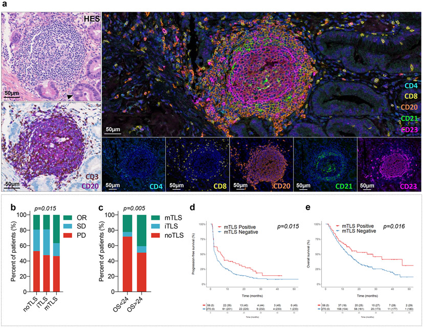 一項研究[7]分析了從 328 名接受抗 PD-1 或抗 PD-L1 抗體治療的患者獲得的治療前存檔腫瘤樣本,研究發(fā)現(xiàn)105 例患者 (32%) 中存在 TLS,其中 84 例具有成熟 TLS (25.6%)。在成熟 TLS 組中, 84 名患者中有 31 名 (36.9%; 95% CI, 26.6%–48.1%) 獲得客觀緩解,而 21 名TLS 不成熟患者中有 4 名獲得客觀緩解 (19.3%; 95% CI, 5.4%–41.9%),223 名TLS 陰性患者中有 43 名獲得客觀緩解(19%;95% CI,14.3%–25.1%),三組中的比例有顯著差異(p=0.015),據(jù)此可見TLS的存在與免疫治療的預后有明顯相關(guān)性(圖6)。