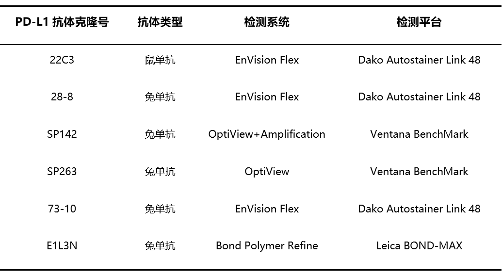 PD?L1免疫組織化學(xué)抗體需與配套的檢測(cè)系統(tǒng)在對(duì)應(yīng)的檢測(cè)平臺(tái)中進(jìn)行:目前有多個(gè)PD-L1 免疫組織化學(xué)檢測(cè)抗體試劑盒,如22C3 pharmDx(Dako)、28-8 pharmDx (Dako)、SP142(Ventana)、SP263(Ventana)、73-10(Dako)及E1L3N(CST),在3個(gè)免疫組織化學(xué)平臺(tái)(Dako Autostainer Link 48、Ventana BenchMark、Leica Bond 免疫組織化學(xué)全自動(dòng)染色系統(tǒng))進(jìn)行檢測(cè)。除了73-10外,其他5種抗體都已經(jīng)在國(guó)內(nèi)獲批。