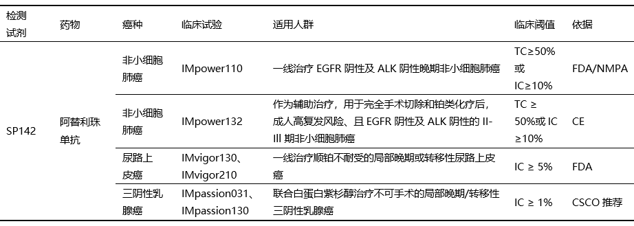 下表中列出了部分PD-L1表達(dá)檢測(cè)使用SP142抗體的臨床試驗(yàn),及基于PD-L1表達(dá)分層分析的療效數(shù)據(jù)形成的臨床cut-off值(表5)。