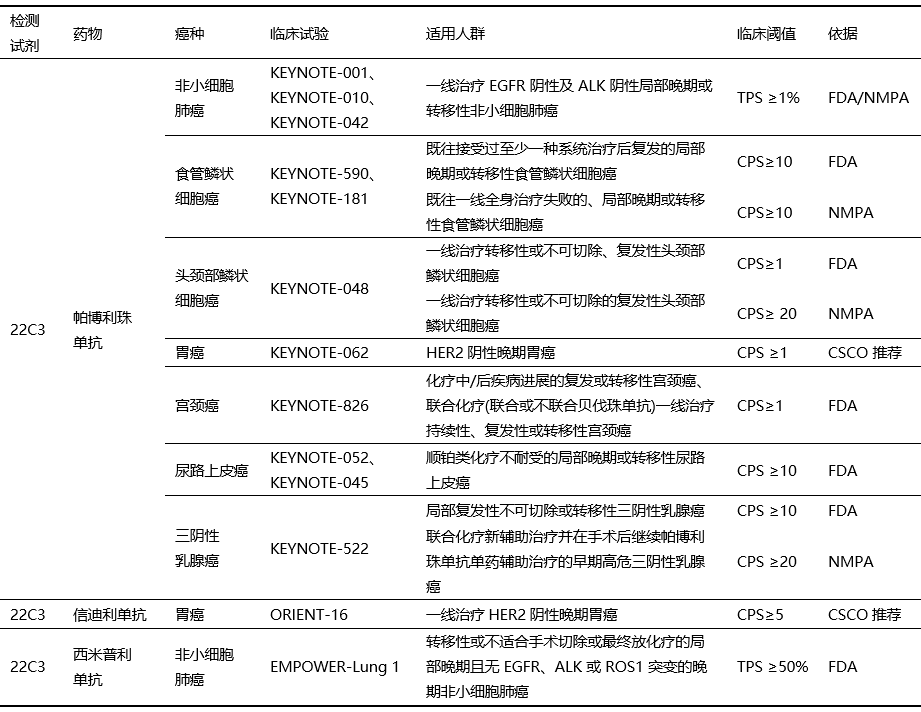 后續(xù)多個(gè)臨床試驗(yàn)中PD-L1表達(dá)檢測(cè)都使用了22C3抗體,并基于PD-L1表達(dá)分層分析的療效數(shù)據(jù)在不同適應(yīng)癥中形成了臨床cut-off值(表2)。