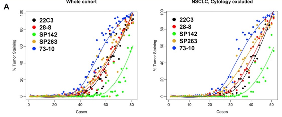 隨后的藍(lán)印計劃2期研究加入了大家熟悉的73-10檢測抗體,與22C3和28-8一樣,73-10抗體為阿維魯單抗的診斷試劑。藍(lán)印計劃2期研究也擴(kuò)大了樣本量、樣本類型及病理醫(yī)生的團(tuán)隊,以便更好的評估真實世界臨床樣本結(jié)果,該研究在81例肺癌樣本中使用22C3、28-8、SP142、SP263及73-10抗體進(jìn)行檢測, 2期研究確認(rèn)了1期的研究結(jié)論:28-8、22C3和SP263三種抗體檢測腫瘤細(xì)胞具有一致性,SP142 檢出陽性細(xì)胞較少,敏感性低,新加入的73-10抗體相比于其他抗體可檢出更多的陽性細(xì)胞,表現(xiàn)出更高的靈敏度(圖3)。
