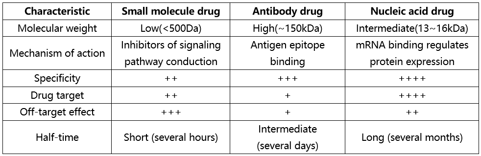 表1 核酸藥物與抗體、小分子藥物對(duì)比