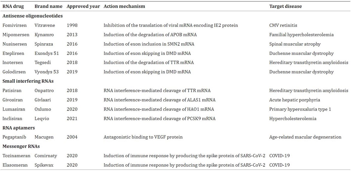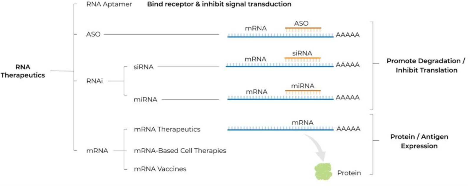 核酸藥物根據(jù)其結(jié)構(gòu)和作用機(jī)制可分為四類:反義寡核苷酸類 (ASO)、小干擾RNA類(siRNA)、適配體類(Aptamer)和信使RNA類 (mRNA),其中前三類統(tǒng)稱為小核酸藥物。