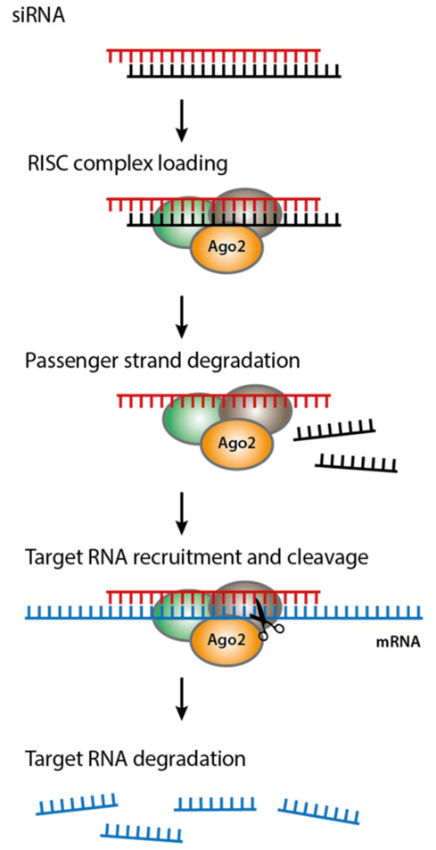 siRNA是長(zhǎng)度為21-25 nt與靶基因互補(bǔ)的小片段雙鏈RNA,進(jìn)入細(xì)胞后先形成RISC前體,然后被切斷并解離得到RISC復(fù)合物,該復(fù)合物中保留的siRNA引導(dǎo)鏈與靶標(biāo) mRNA結(jié)合,引導(dǎo) RISC 切斷該mRNA,抑制蛋白合成。