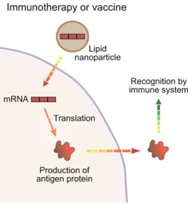 編碼抗原序列的mRNA疫苗通過脂質(zhì)納米載體等遞送平臺(tái)被引入細(xì)胞,然后通過翻譯產(chǎn)生抗原,激活免疫反應(yīng)。