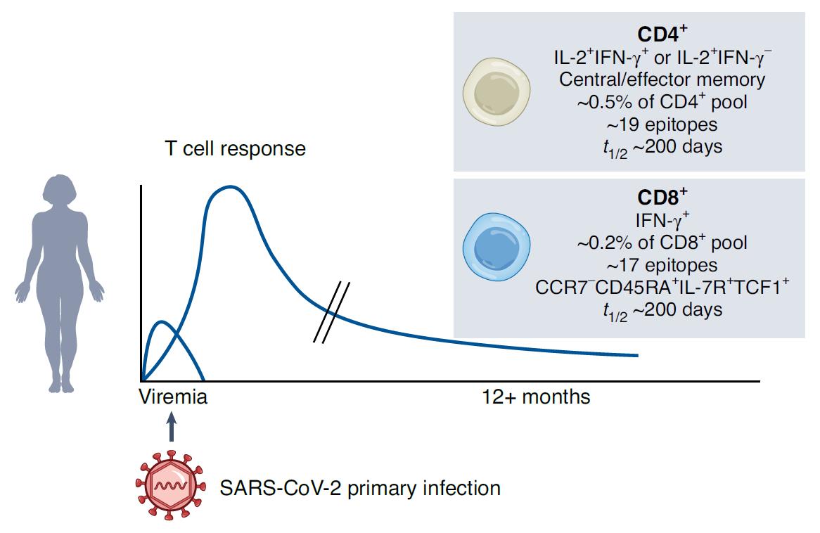 圖4 CD4+T和CD8+T細(xì)胞在新冠感染后保持12個月的記憶性細(xì)胞應(yīng)答 [13]