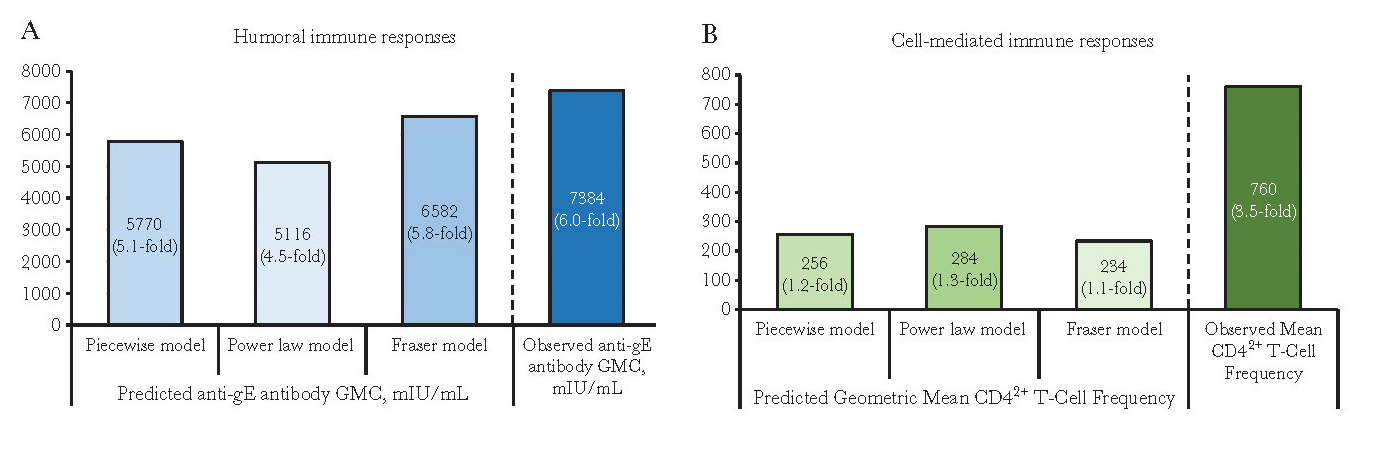 VZV特異性抗體及VZV?CMI是評價帶狀皰疹疫苗免疫原性的兩個重要指標(biāo)。在細(xì)胞免疫應(yīng)答評價中,胞內(nèi)因子染色分析2種及以上細(xì)胞因子(IFN-γ,IL-2,TNF-α,CD40L)的VZV特異性CD4+ T細(xì)胞水平,顯示gE/AS01B誘導(dǎo)出較高的VZV特異性CD4+ T細(xì)胞水平,但未能誘導(dǎo)出CD8+ T細(xì)胞。長達(dá)10年隨訪研究發(fā)現(xiàn),體液免疫水平是接種前的6.0倍,細(xì)胞免疫水平是接種前的3.5倍,此外,相關(guān)的數(shù)學(xué)模型也預(yù)測疫苗相關(guān)免疫應(yīng)答在首次疫苗接種后可維持至少20年 [17-18] 。