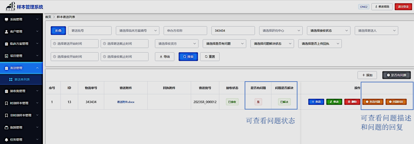 2.中心實(shí)驗(yàn)室收到的樣本難免有一些需要確認(rèn)的問題,比如標(biāo)簽與寄送清單不一致。這些問題直接關(guān)系到樣本的識別,進(jìn)而可能影響分析結(jié)果的準(zhǔn)確性,因此對這些問題的追蹤非常重要。然而,申辦方很難全面地、實(shí)時(shí)地查看這些問題以及對問題的回復(fù)。