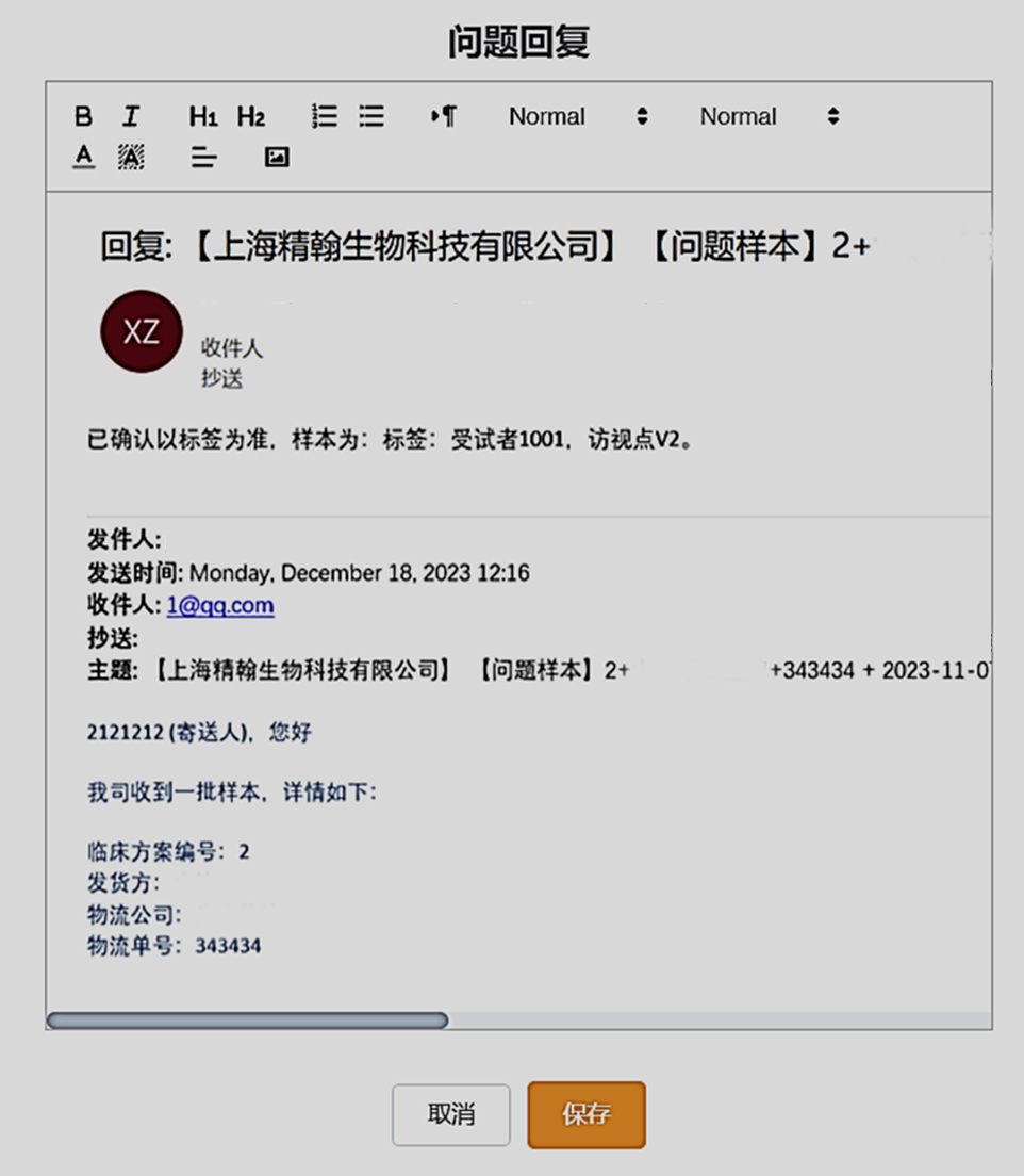 研究中心人員或者申辦方可以直接在郵件進(jìn)行回復(fù)。中心實(shí)驗(yàn)室收到郵件回復(fù)后,可以將回復(fù)的郵件上傳到系統(tǒng)中,申辦方和研究中心人員可以隨時(shí)查看: