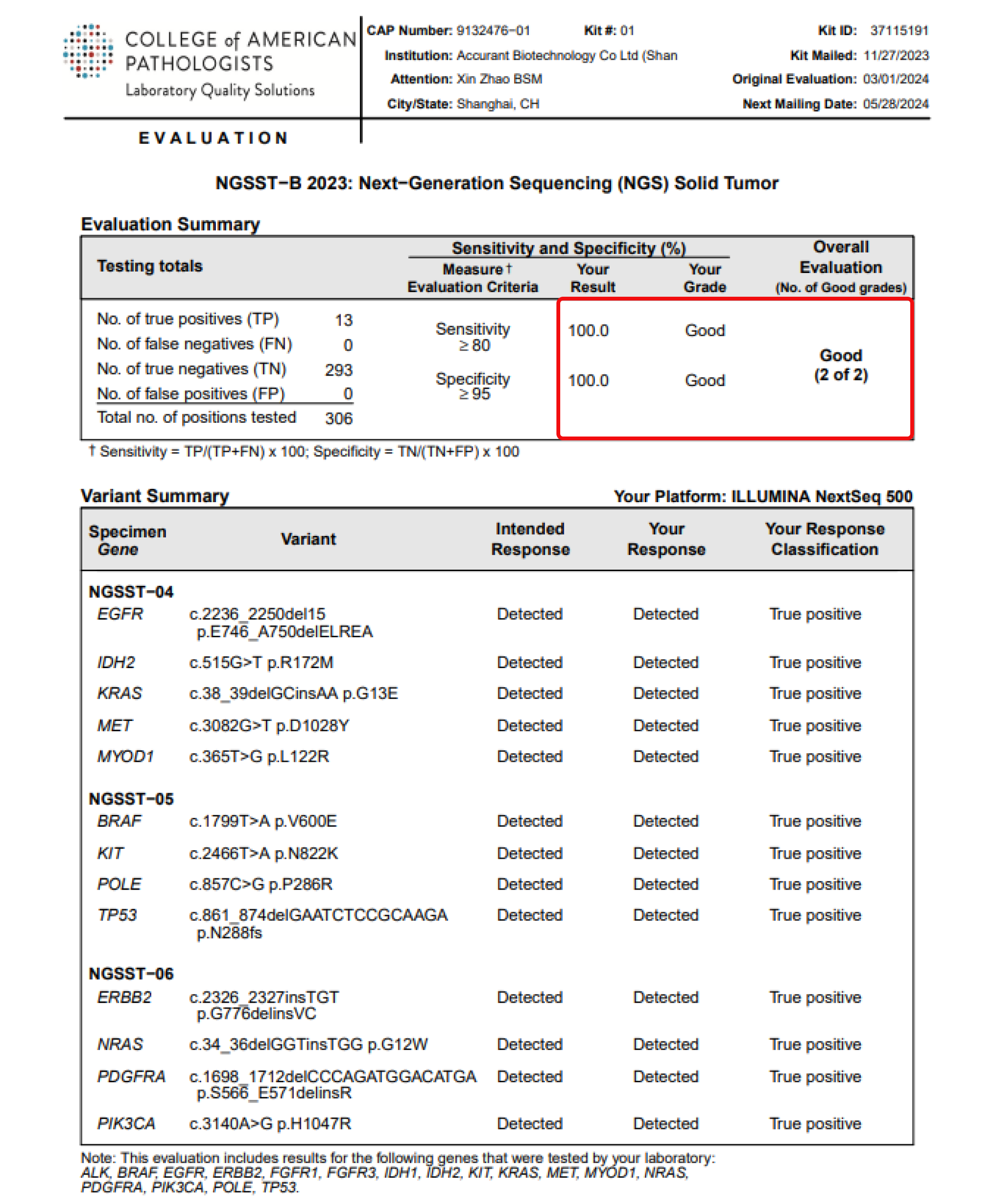 NGSST-B是2023年下半年CAP組織用于評估全球基因檢測實驗室使用二代測序(Next-Generation Sequencing,NGS)方法,檢測實體瘤組織基因變異能力的項目。本次檢測涵蓋EGFR、KRAS、BRAF、MET、ERBB2、NRAS、TP53、PIK3CA、IDH2、MYOD1、KIT、POLE、PDGFRA等常見腫瘤驅(qū)動相關(guān)基因,涉及SNV、Indel等突變類型。整個過程涵蓋實驗操作、生物信息分析、結(jié)果解讀等全流程,熙寧生物|精翰生物檢測結(jié)果與CAP所公布的標準結(jié)果100%一致。