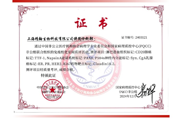 近日,熙寧生物|精翰生物參加中國(guó)非公立醫(yī)療機(jī)構(gòu)協(xié)會(huì)病理學(xué)專業(yè)委員會(huì)和國(guó)家病理質(zhì)控中心(PQCC)非公組聯(lián)合組織的免疫組化室間質(zhì)評(píng)活動(dòng),檢測(cè)指標(biāo)包括CD20、TTF-1、NapsinA、PAX8、P504s、Syn、CgA、ER、PR、HER2、Ki67、Claudin18.2,以上12項(xiàng)檢測(cè)指標(biāo)熙寧生物|精翰生物免疫組化實(shí)驗(yàn)室均高分通過(guò),榮獲合格證書。